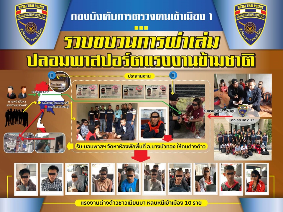 เบื้องต้นผู้ต้องหาจึงให้การรับสารภาพว่า ตนเองเป็นผู้ว่าจ้างนายหน้าในประเทศเมียนมา จัดทำเล่มพาสปอร์ต ในราคาเล่มละประมาณ 20,000 บาท ตำรวจจึงพาตัวผู้ต้องหาไปตรวจค้นบ้านพัก ย่านบางบัวทอง พบตัวผู้ต้องหาชาวเมียนเพิ่มอีก 10 คน จึงนำตัวมาคัดแยกเหยื่อ ทราบว่ามีชาวเมียนมาครอบครองพาสปอร์ตปลอมแล้ว รวม 4 ราย จึงแจ้งข้อหาร่วมกันปลอมแปลงพาสปอร์ต ส่วนผู้ต้องหาที่เหลือตำรวจแจ้งข้อหาหลบหนีเข้าเมืองโดยไม่ได้รับอนุญาต .-สำนักข่าวไทย