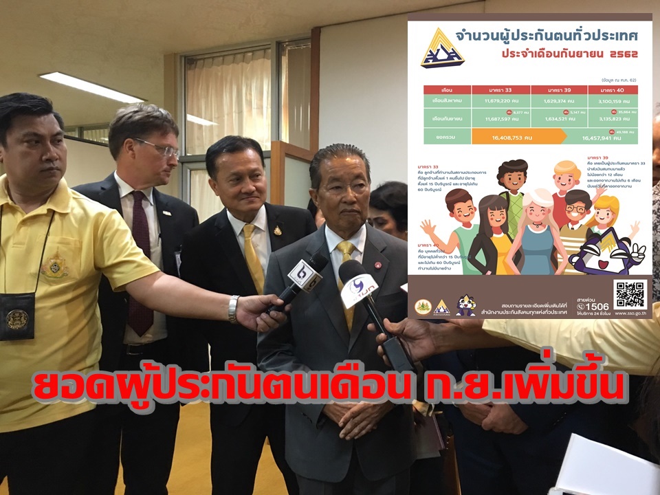 ม.ร.ว.จัตุมงคล โสณกุล รัฐมนตรีว่าการกระทรวงแรงงาน เปิดเผยถึง ตัวเลขผู้ประกันตนในระบบประกันสังคมเดือนกันยายน 2562 ว่า จากข้อมูลสำนักสิทธิประโยชน์ สำนักงานประกันสังคม ณ กันยายน 2562 มีผู้ประกันตนในระบบประกันสังคมทุกมาตราคือ33, 39, 40 ทั้งหมด 16,457,941 คน ซึ่งมีตัวเลขเพิ่มจากเดือนสิงหาคม 2562 ที่ผ่านมา เพิ่มขึ้นถึง 49,188 คน