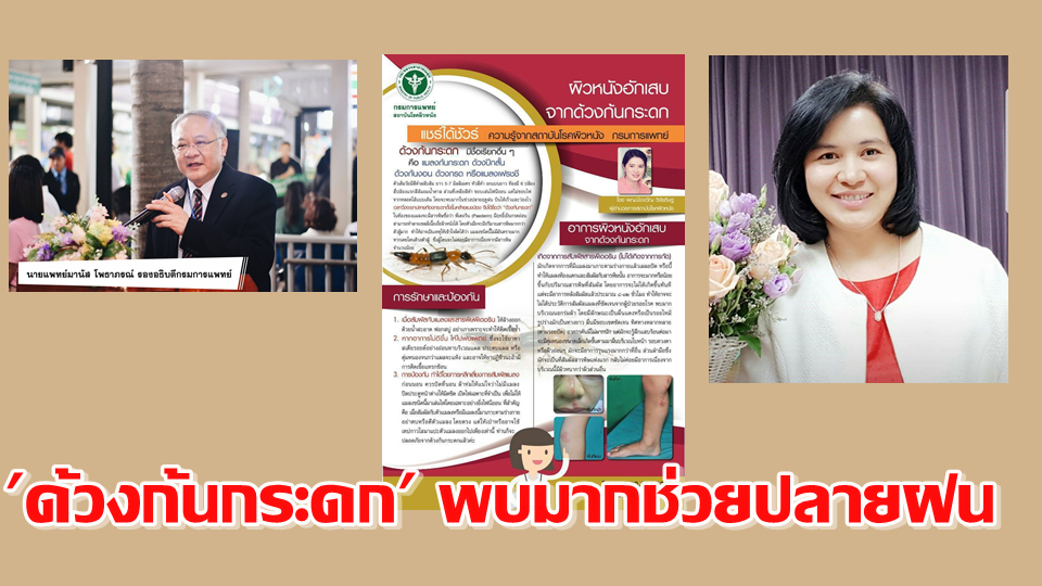 กรมการแพทย์ 8 ต.ค.-แพทย์ผิวหนังเตือนประชาชนช่วงปลายฝนให้ระวังโรคผิวหนังจากการสัมผัส ‘ด้วงก้นกระดก’ พบมากบริเวณนอกร่มผ้า ลักษณะเป็นผื่นแดงหรือเป็นรอยไหม้ หากรับพิษมาก แพ้รุนแรงจะมีไข้สูง มีอาการทางระบบหายใจ และหากเป็นที่ตาอาจทำให้ตาบอด