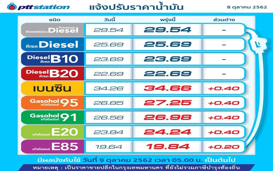 PTT Station และ บางจากฯ ปรับราคาขายปลีกน้ำมันกลุ่มเบนซินและแก๊สโซฮอลล์เพิ่มขึ้น 40 สตางค์ต่อลิตร ยกเว้น E85 เพิ่มขึ้น 20 สตางค์ต่อลิตร ส่วนกลุ่มดีเซลคงเดิม มีผล 9 ตุลาคม 2562 เวลา 05.00 น. เป็นต้นไป โดยราคาขายปลีกจะเป็นดังนี้ เบนซิน 95 อยู่ที่ 34.66 บาท แก๊สโซฮอล์ 95 อยู่ที่ 27.25 บาท E20 อยู่ที่ 24.24 บาท แก๊สโซฮอล์ 91 อยู่ที่ 26.98 บาท E85 อยู่ที่ 19.84 บาท ดีเซล 25.69 บาท ดีเซลพรีเมี่ยม 29.54 บาท B10 อยู่ที่ 23.69 บาท และ B20 อยู่ที่ 22.69 บาทต่อลิตร โดยราคาขายปลีกข้างต้นยังไม่รวมภาษีบำรุงกรุงเทพมหานคร.-สำนักข่าวไทย