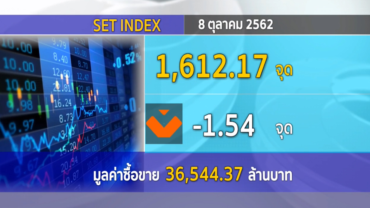 กรุงเทพฯ 8 ต.ค. – ดัชนีตลาดหลักทรัพย์ฯ ปิดวันนี้ (8 ต.ค.) ที่ระดับ 1,612.17 จุด ลดลง 1.54 จุด มูลค่าการซื้อขาย 36,544.37 ล้านบาท สวนทางตลาดภูมิภาค จับตาเจรจาการค้าสัปดาห์นี้.-สำนักข่าวไทย