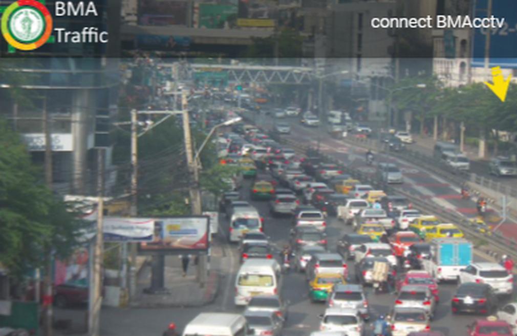 ถนนดินแดง ขาเข้า มุ่งหน้าสามเหลี่ยมดินแดง ต่อเนื่องเข้าอนุสาวรีย์ชัยฯ รถติดขัดมาก ท้ายแถวสะสมอยู่ที่บริเวณใต้ทางด่วนดินแดง