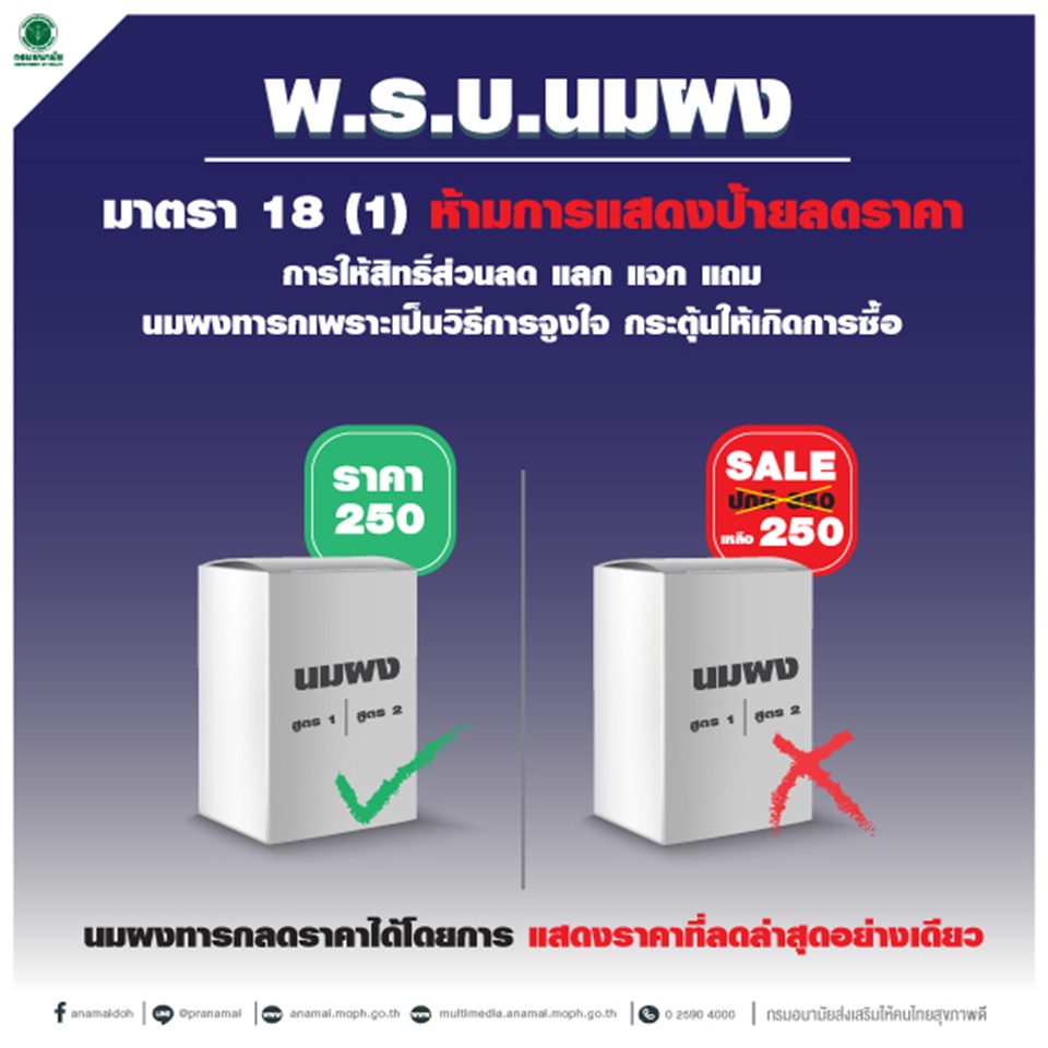 “ที่ผ่านมากรมอนามัยในฐานะหน่วยงานรับผิดชอบการขับเคลื่อนการบังคับใช้กฎหมายฉบับนี้ได้ดำเนินการเปรียบเทียบคดีผู้กระทำความผิดไปแล้ว และขณะนี้ยังคงมีผู้ประกอบการและร้านค้าอีกหลายรายที่กระทำความผิดตามมาตรา18 และมาตราอื่นๆ ที่อยู่ระหว่างดำเนินคดีทางกฎหมาย ซึ่งรู้สึกเป็นห่วงกังวลกับสถานการณ์ดังกล่าว เนื่องจากวิธีการลงโทษทางกฎหมายไม่ใช่เป้าประสงค์หลักในการขับเคลื่อนกฎหมายฉบับนี้ แต่สิ่งที่ให้ความสำคัญและเป็นเป้าหมายในการดำเนินงานคือการปกป้อง ส่งเสริม สนับสนุนโดยเฉพาะแม่และครอบครัว ดังนั้นจึงขอฝากไปถึงผู้ประกอบการโดยเฉพาะร้านค้าในช่องทางออนไลน์ว่า “ร้านค้าสามารถแสดงราคาจำหน่ายของนมผงสำหรับทารก(นมผงสูตร1และสูตร2)ได้ โดยต้องไม่แสดงการเปรียบเทียบกับราคาเดิมและไม่มีการโฆษณาในลักษณะลด แลก แจก แถม”หากมีข้อสงสัยเกี่ยวกับ พ.ร.บ.ควบคุมการส่งเสริมการตลาดอาหารสำหรับทารกและเด็กเล็ก พ.ศ.2560 ติดต่อสอบถามข้อมูลเพิ่มเติมได้ที่กรมอนามัย หมายเลขโทรศัพท์ 0 2590 4223
