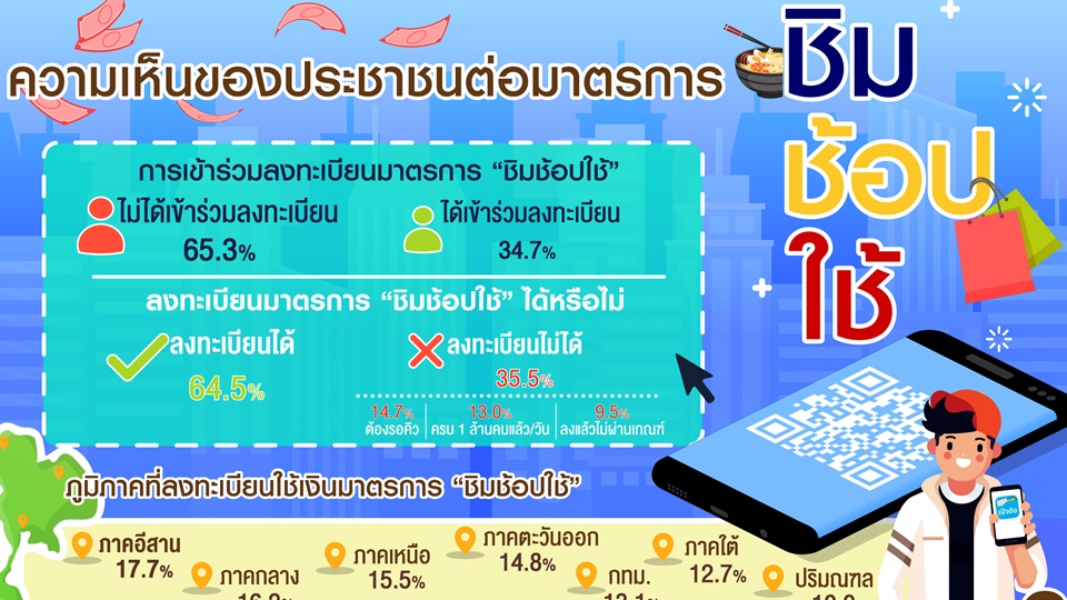 ประชาชนที่เข้าร่วมลงทะเบียนมาตรการ ชิม ช้อป ใช้ ส่วนใหญ่ร้อยละ 64.5 สามารถลงทะเบียนได้ ขณะที่ร้อยละ 35.5 ไม่สามารถลงทะเบียนได้ โดยในจำนวนนี้ร้อยละ 14.7 ให้เหตุผลว่าต้องรอคิว รองลงมาร้อยละ 13.0 ให้เหตุผลว่าครบ 1 ล้านคนต่อวันแล้ว และร้อยละ 9.5 ลงแล้วไม่ผ่านเกณฑ์
