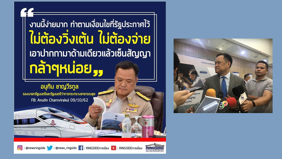 ส่วนเรื่องจะเกี่ยวกับเรื่องรถไฟฟ้าความเร็วสูง ก็เป็นเรื่องของการตีความ แต่ย้ำว่าทุกอย่างทำประโยชน์ เพื่อประโยชน์ เพื่อประชาชน และยืนยันไม่ได้หักกับกลุ่มทุนรายใหญ่ และตนมีแต่ความรัก ปากกาด้ามเดียว เซ็นอะไรก็ได้ ที่ทำประโยชน์กับประชาชน .-สำนักข่าวไทย