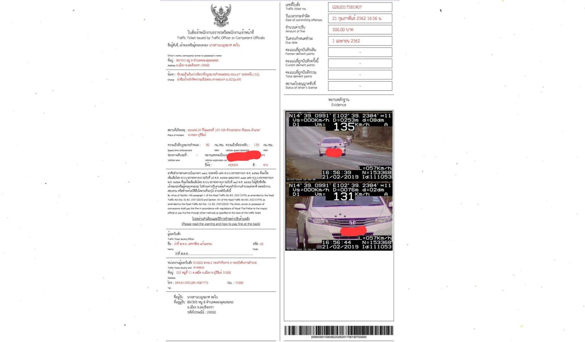 จากนั้นเจ้าพนักงานจราจร จึงได้ออกใบสั่ง ในข้อหา ขับรถเร็วเกินกว่าอัตราที่กฎหมายกำหนด(ตาม พรบ.จร.ม.67 วรรคหนึ่ง,152) และ ฝ่าฝืนป้ายจำกัดความเร็ว(ตาม พรบ.ทางหลวงฯ ม.5(2),ม.69) โดยให้ชำระค่าปรับตามใบสั่งจำนวน 500 บาท ซึ่งถนนบริเวณจุดที่เกิดเหตุนั้นกฎหมายได้กำหนด 90 กม./ชม.(Speed limit enforcement)โดยความเร็วที่ตรวจจับได้ของผู้กระทำผิดคือ 135 กม./ชม.