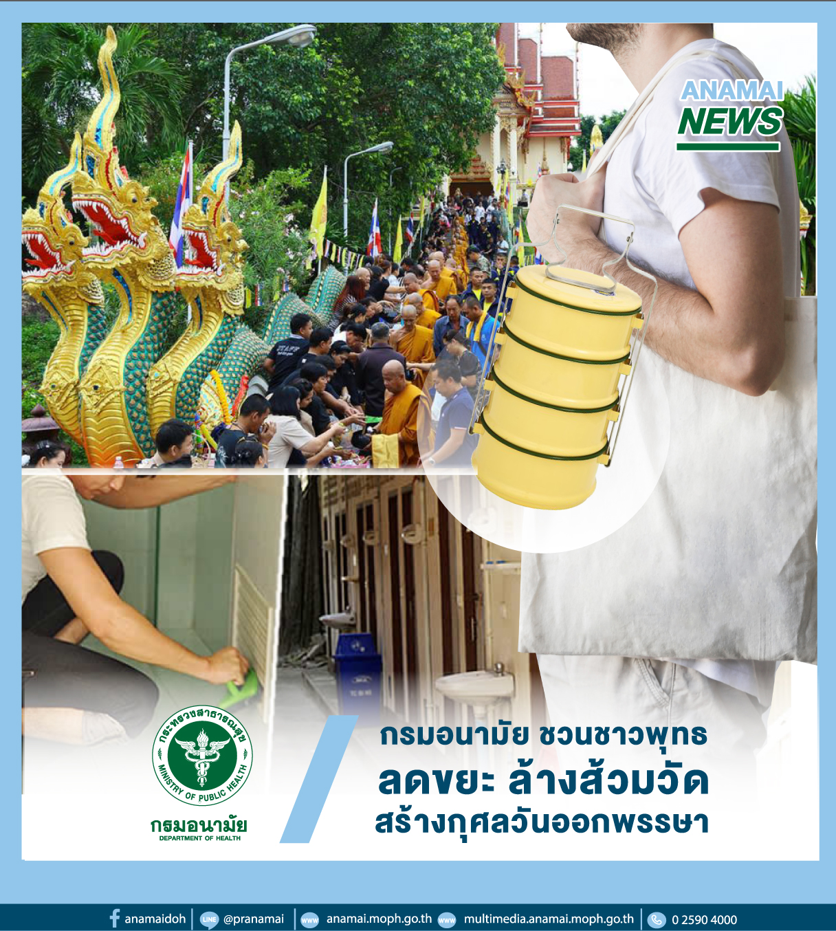 กรมอนามัย11 ตค.- ชวนชาวพุทธลดขยะ ใช้ถุงผ้า ตะกร้า ปิ่นโตใส่ของและอาหารไปวัดแทนการใช้ถุงพลาสติกและภาชนะโฟม ล้างส้วมวัด สร้างกุศลวันออกพรรษา