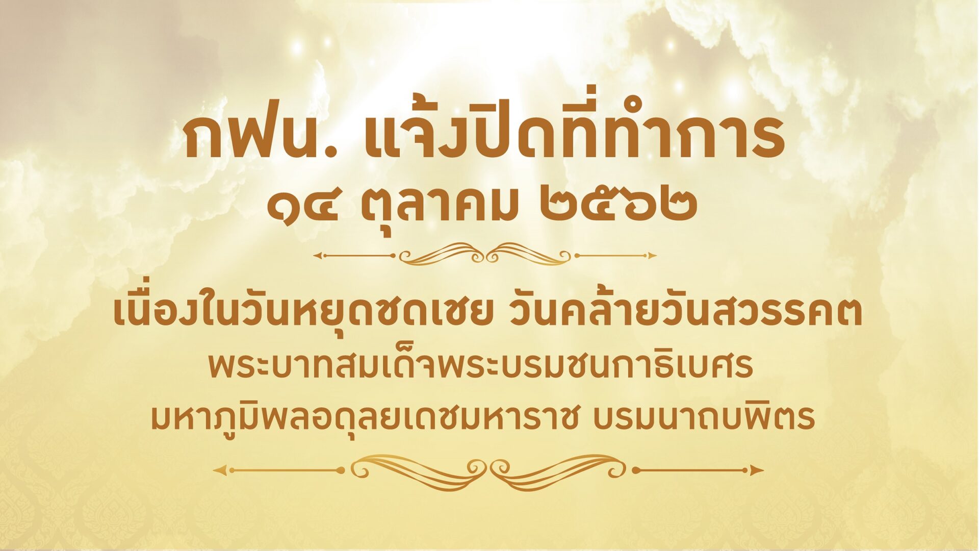 การไฟฟ้านครหลวง (MEA) แจ้งปิดที่ทำการทุกแห่งเนื่องในวันหยุดชดเชย วันคล้ายวันสวรรคตของพระบาทสมเด็จพระบรมชนกาธิเบศร มหาภูมิพลอดุลยเดชมหาราช บรมนาถบพิตร 14 ตุลาคม 2562 จึงแจ้งปิดที่ทำการต่อเนื่อง ตั้งแต่วันเสาร์ที่ 12 – วันจันทร์ที่ 14 ตุลาคม 2562 ยกเว้นเคาน์เตอร์ที่ศูนย์บริการภาครัฐแบบเบ็ดเสร็จ (Government Center) ที่เปิดทำการพร้อมให้บริการชำระค่าไฟฟ้าปกติ 3 แห่ง ได้แก่ ศูนย์การค้าเซ็นทรัลพลาซาเวสต์เกต โซน Fashion ชั้น 1 และห้างเซ็นทรัลแจ้งวัฒนะ บริเวณชั้น 3 ระหว่างเวลา 10.00-17.30 น. และห้างสรรพสินค้าเดอะมอลล์งามวงศ์วาน บริเวณชั้น 3 ระหว่างเวลา 10.30-18.00 น. เป็นต้นไป ทั้งนี้ กฟน. จะเปิดทำการ และให้บริการรับชำระค่าไฟฟ้าตามปกติ ในวันอังคารที่ 15 ตุลาคม 2562 ระหว่างเวลา 07.30-15.30 น. (ให้บริการรับชำระค่าไฟฟ้า และธุรกรรมทางการเงิน เวลา 07.30-15.00 น.) สำหรับในช่วงเวลาปิดทำการ สามารถชำระค่าไฟฟ้า โดยผ่านช่องทาง MEA Smart Life Application หักผ่านบัตรเครดิต Mastercard และ Visa ซึ่งสามารถชำระได้ทุกวัน ไม่เว้นวันหยุด ผู้สนใจสามารถดาวน์โหลดแอปพลิเคชันได้ที่ App Store และ Google Play ดาวน์โหลดฟรี คลิก http://is.gd/KlyQKF หักบัญชีบัตรเครดิต ชำระผ่านทาง ATM ชำระผ่านทาง Internet Banking ชำระผ่านทาง Mobile Banking หรือชำระผ่านตัวแทนรับชำระค่าไฟฟ้าทุกแห่ง เช่น เคาน์เตอร์เซอร์วิส ธนาคาร เทสโก้โลตัส และบิ๊กซี เป็นต้น