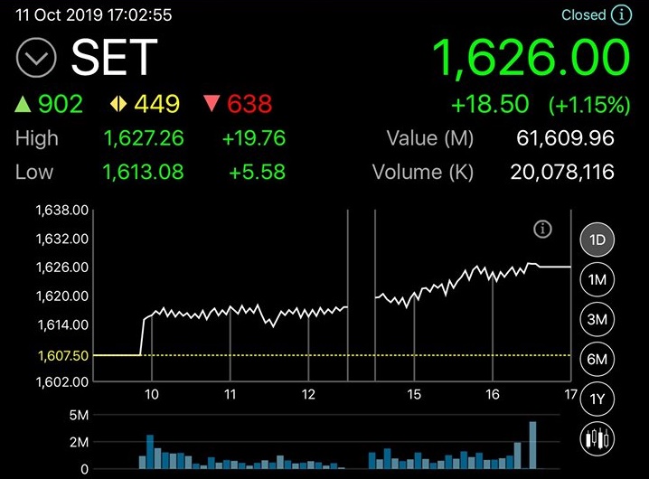 ตลาดหลักทรัพย์แห่งประเทศไทย 11 ต.ค. – ตลาดหลักทรัพย์ปิดวันนี้ที่ระดับ 1,626.00 จุด เพิ่มขึ้น 18.50 จุด (+1.15%) มูลค่าการซื้อขาย 61,609.96 ล้านบาท