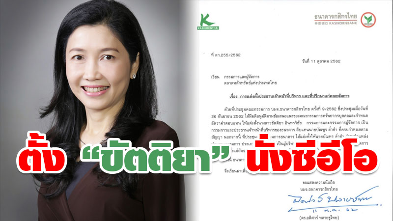 กรุงเทพฯ 11 ต.ค. – บมจ.ธนาคารกสิกรไทย แจ้งว่า ที่ประชุมคณะกรรมการ บมจ. ธนาคารกสิกรไทยครั้งที่ 9/2562 ซึ่งประชุมเมื่อวันที่ 26 กันยายน 2562 ได้มีมติอนุมัติตามข้อเสนอแนะของคณะกรรมการทรัพยากรบุคคลและกำหนดอัตราค่าตอบแทนให้แต่งตั้งนางสาวขัตติยา อินทรวิชัย กรรมการและกรรมการผู้จัดการเป็นกรรมการและประธานเจ้าหน้าที่บริหารของธนาคารสืบแทนนายบัณฑูร ล่ำซำที่ครบกำหนดตามสัญญา