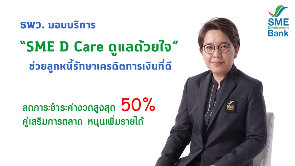 กรุงเทพฯ 14 ต.ค. – ธพว.ขานรับนโยบายแบงก์ชาติ เปิดบริการ “SME D Care ดูแลด้วยใจ” ช่วยลูกหนี้รักษาเครดิตการเงินที่ดี ดันมาตรการลดภาระชำระค่างวดสูงสุด 50% คู่เสริมการตลาด หนุนเพิ่มรายได้