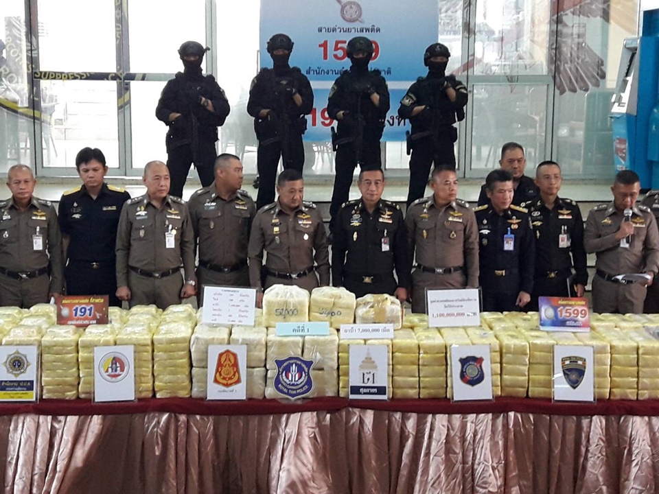 พลตำรวจเอกสุชาติ ธีระสวัสดิ์ รองผู้บัญชาการตำรวจแห่งชาติ พร้อมด้วย พลตำรวจโทชินภัทร สารสิน ผู้บัญชาการตำรวจปราบปรามยาเสพติด แถลงผลการจับกุมผู้ต้องหาขบวนการค้ายาเสพติด หลายคดี