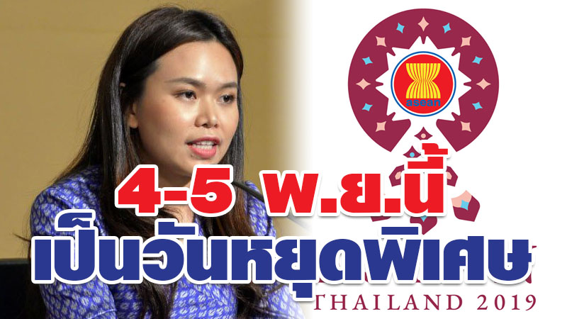 ทำเนียบ 15 ต.ค.- ครม. มีมติ ให้ 4-5 พ.ย.62 เป็นวันหยุดกรณีพิเศษ เฉพาะ กทม.- นนทบุรี เพื่ออำนวยความสะดวกการจราจจร และการอารักขาผู้นำประเทศที่มาร่วมประชุม เนื่องในโอกาสที่ไทยเป็นเจ้าภาพ จัดประชุมสุดยอดอาเซียน ครั้งที่ 35