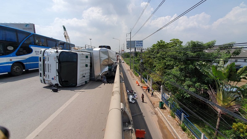 สมุทรสาคร 15 ต.ค.- อุบัติเหตุบ่ายนี้ (15 ต.ค.) เมืองสมุทรสาคร รถบรรทุกสินค้าพลิกตะแคงบนสะพานข้ามทางรถไฟคอกกระบือ คนงานนั่งท้ายร่วงลงด้านล่างบาดเจ็บ คนขับให้การล้อตกหลุมเสียการทรงตัว