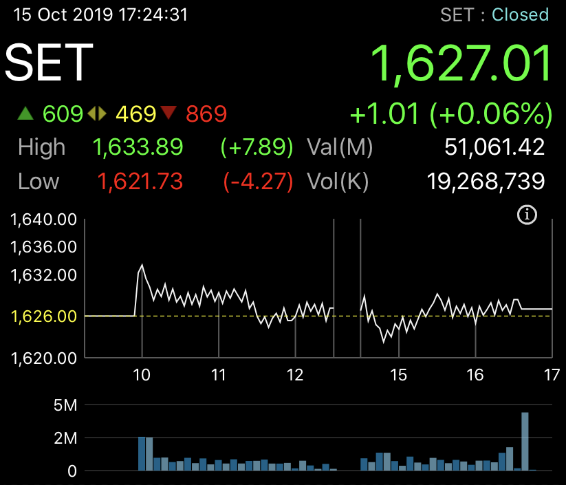 ตลาดหลักทรัพย์แห่งประเทศไทย 15 ต.ค. – ตลาดหลักทรัพย์ปิดวันนี้ที่ระดับ 1,627.01 จุด เพิ่มขึ้น 1.01 จุด (+0.06%) มูลค่าการซื้อขาย 51,061.42 ล้านบาท
