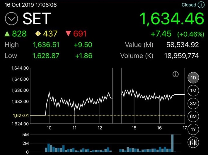 กรุงเทพฯ 16 ต.ค. – หุ้นไทยปิดบวก 7.45 จุด ตอบรับเจรจาการค้าเป็นบวก จับตาสภาฯ ถกงบปี 63 พรุ่งนี้