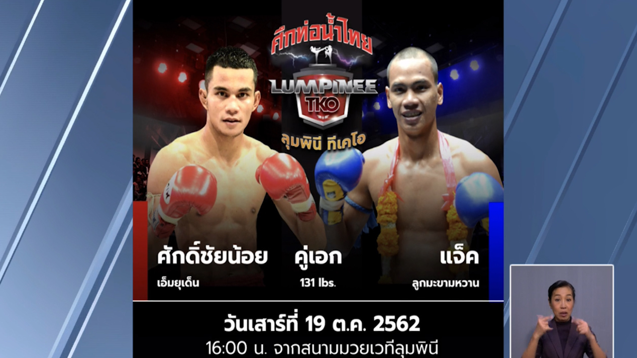 19 ต.ค. – แฟนมวยไทยพันธุ์แท้ ต้องไม่พลาด..!! เวทีลุมพินีวันเสาร์นี้ จัดเต็ม ศึกมวยไทยลุมพินี TKO ช่อง 9 MCOT HD หมายเลข 30 ถ่ายทอดสดเวลาดี 4 โมงเย็น เต็มอิ่ม 2 ชั่วโมง มีมวยดีมวยมัน .- สำนักข่าวไทย