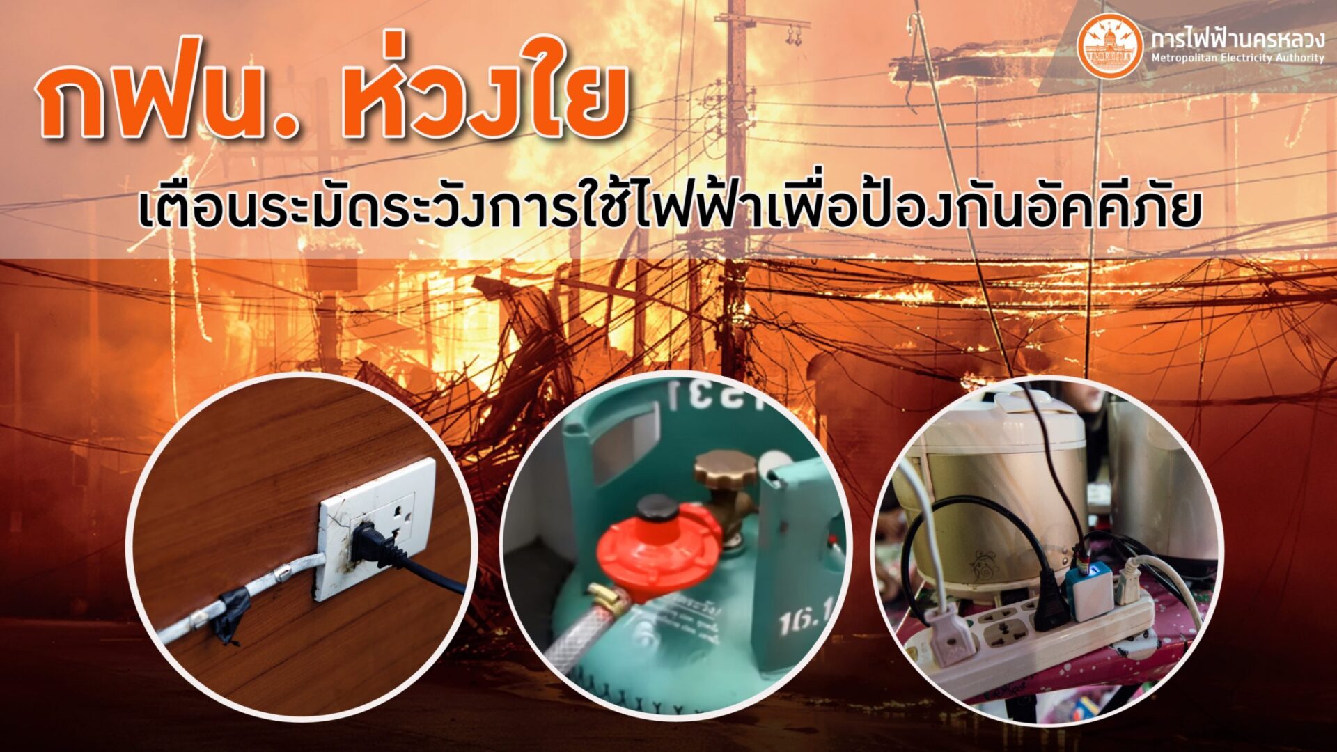 ดังนั้น เพื่อความปลอดภัยและเพื่อป้องกันการเกิดอัคคีภัย MEA จึงขอแนะนำให้ทุกบ้านตรวจสอบและดูแลอุปกรณ์ไฟฟ้า สายไฟ ปลั๊กไฟให้อยู่ในสภาพสมบูรณ์ ปลอดภัย หากพบว่าชำรุดต้องซ่อมแซมทันที ก่อนออกเดินทางควรปิดสวิตช์ไฟและถอดปลั๊กเครื่องใช้ไฟฟ้าที่ไม่ได้ใช้งานออกทุกครั้ง หลีกเลี่ยงการเสียบปลั๊กพ่วงจนเต็มเต้ารับเพราะอาจทำให้กระแสไฟฟ้าเกินทำให้เกิดความร้อนไม่ปลอดภัย และระมัดระวังการใช้ไฟฟ้าเพื่อความปลอดภัย โดยเฉพาะอย่างยิ่งอุปกรณ์ไฟฟ้าที่ให้ความร้อนควรหมั่นตรวจสอบเป็นพิเศษ ควรปิดสวิตช์ทุกครั้งหลังเลิกใช้งาน ไม่ปรับอุณหภูมิความร้อนเกินความจำเป็น ปิดแก๊สหุงต้มเมื่อเลิกใช้งาน ไม่จุดธูปเทียนบูชาพระ หรือจุดบุหรี่ทิ้งไว้ โดยที่ไม่มีคนอยู่ในบ้าน สำหรับเครื่องใช้ไฟฟ้าบางชนิด เช่น โทรทัศน์ ตู้เย็น ควรวางเว้นระยะจากผนังเพื่อระบายความร้อน ควรมีถังดับเพลิงที่ได้มาตรฐานในจำนวนที่เหมาะสมกับขนาดของบ้าน พร้อมศึกษาวิธีการใช้งานให้เข้าใจอย่างละเอียด