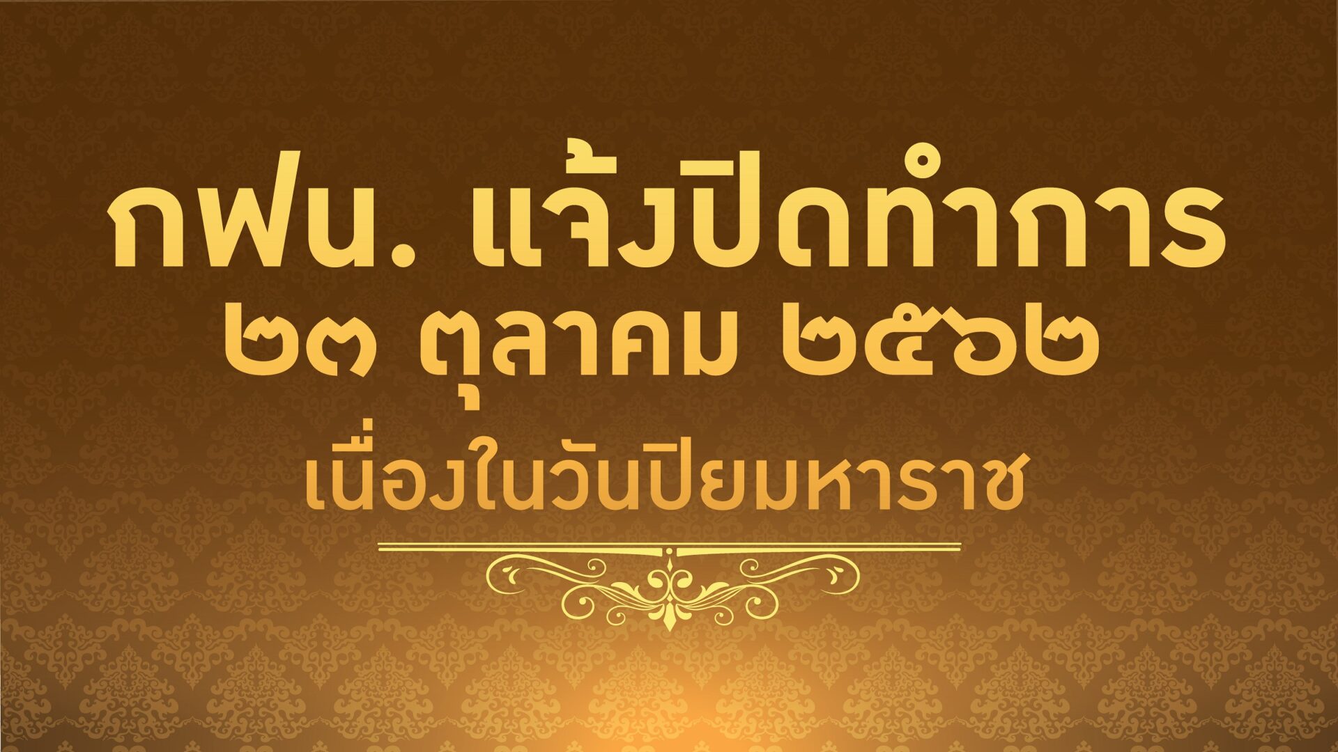 การไฟฟ้านครหลวง (MEA) แจ้งปิดทำการทุกแห่งเนื่องในวันปิยมหาราช ในวันวันพุธที่ 23 ตุลาคม 2562 ยกเว้นเคาน์เตอร์ที่ศูนย์บริการภาครัฐแบบเบ็ดเสร็จ (Government Center) ที่เปิดทำการพร้อมให้บริการชำระค่าไฟฟ้าปกติ 3 แห่ง ได้แก่ ศูนย์การค้าเซ็นทรัลพลาซาเวสต์เกต โซน Fashion ชั้น 1 และห้างเซ็นทรัลแจ้งวัฒนะ บริเวณชั้น 3 ระหว่างเวลา 10.00-17.30 น. และห้างสรรพสินค้าเดอะมอลล์งามวงศ์วาน บริเวณชั้น 3 ระหว่างเวลา 10.30-18.00 น. เป็นต้นไป ทั้งนี้ กฟน. จะเปิดทำการ และให้บริการรับชำระค่าไฟฟ้าตามปกติ ในวันพฤหัสบดีที่ 24 ตุลาคม 2562 ระหว่างเวลา 07.30-15.30 น. (ให้บริการรับชำระค่าไฟฟ้า และธุรกรรมทางการเงิน เวลา 07.30-15.00 น.) สำหรับในช่วงเวลาปิดทำการ สามารถชำระค่าไฟฟ้า โดยผ่านช่องทาง MEA Smart Life Application หักผ่านบัตรเครดิต Mastercard และ Visa ซึ่งสามารถชำระได้ทุกวัน ไม่เว้นวันหยุด ผู้สนใจสามารถดาวน์โหลดแอปพลิเคชันได้ที่ App Store และ Google Play ดาวน์โหลดฟรี คลิก http://is.gd/KlyQKF หักบัญชีบัตรเครดิต ชำระผ่านทาง ATM ชำระผ่านทาง Internet Banking ชำระผ่านทาง Mobile Banking หรือชำระผ่านตัวแทนรับชำระค่าไฟฟ้าทุกแห่ง เช่น เคาน์เตอร์เซอร์วิส ธนาคาร เทสโก้โลตัส และบิ๊กซี เป็นต้น