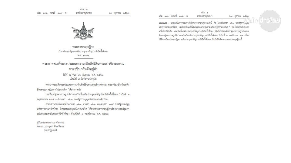 อาศัยอานาจตามความในมาตรา 121 มาตรา 122 และมาตรา 175 ของรัฐธรรมนูญแห่งราชอาณาจักรไทย จึงทรงพระกรุณาโปรดเกล้าฯ ให้ตราพระราชกฤษฎีกาเรียกประชุมรัฐสภาสมัยประชุมสามัญประจาปี ครั้งที่สอง ตั้งแต่วันที่ 1 พฤศจิกายน พ.ศ.2532 มี พล.อ.ประยุทธ์ จันทร์โอชา นายกรัฐมนตรี เป็นผู้รับสนองพระบรมราชโองการ . – สำนักข่าวไทย