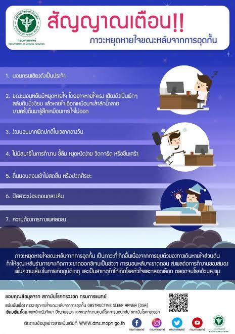 นายแพทย์สมศักดิ์ อรรฆศิลป์ อธิบดีกรมการแพทย์ เปิดเผยว่า ภาวะหยุดหายใจขณะหลับจากการอุดกั้น (Obstructive Sleep Apnea, OSA) เป็นภาวะที่เกิดขึ้นเนื่องจากการยุบตัวของทางเดินหายใจส่วนต้น ทำให้ขณะหลับร่างกายจะเกิดภาวะขาดออกซิเจนเป็นช่วงๆ การนอนหลับจะขาดตอน ส่งผลต่อการทำงานของสมองทำให้เกิดอาการง่วงนอนมากผิดปกติในเวลากลางวัน เพิ่มความเสี่ยงในการเกิดอุบัติเหตุขณะขับรถ และเป็นสาเหตุทำให้เกิดโรคต่างๆ ตามมา เช่น โรคหัวใจและหลอดเลือด โรคอ้วนลงพุง ภาวะนี้สามารถพบได้ในคนทุกวัย จะพบว่าเกิดกับเพศชายมากกว่าเพศหญิง คนในวัยทองและคนอ้วน และอาจพบในเด็กที่มีต่อมทอนซิลและอดีนอยด์โต มีปัญหาโครงสร้างใบหน้า หรือเด็กที่อ้วน