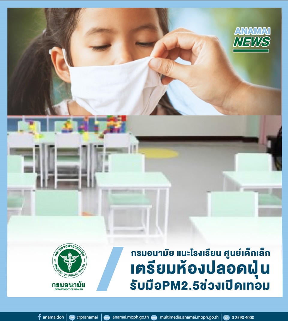 กรมอนามัย 24 ต.ค.-กรมอนามัย ห่วงปัญหาฝุ่นละอองขนาดเล็ก PM2.5ในพื้นที่กรุงเทพฯและปริมณฑล ที่มีแนวโน้มเพิ่มสูงขึ้นในช่วงวันเปิดเทอม แนะนำให้โรงเรียนและศูนย์พัฒนาเด็กเล็ก เตรียมพร้อม ทำความสะอาดตั้งแต่ก่อนเปิดเทอม พร้อมทั้งจัดให้มีห้องปลอดฝุ่น (Cleaner air shelter) เพื่อช่วยเด็กลดความเสี่ยงสูดฝุ่นเข้าสู่ร่างกาย
