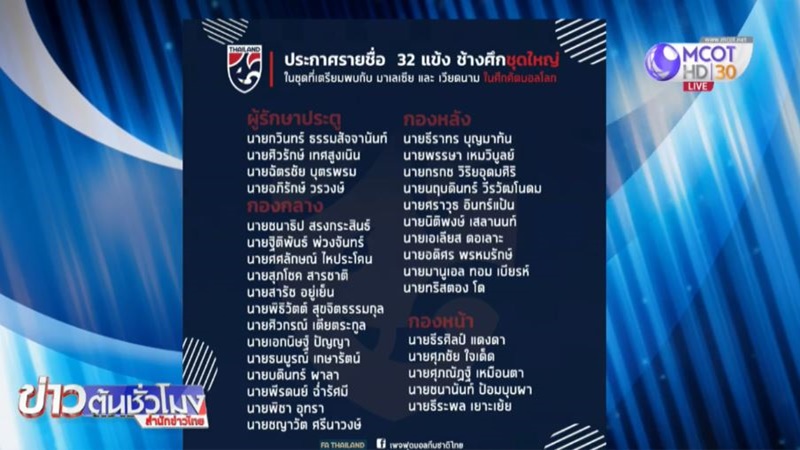 กทม. 24 ต.ค.-อากิระ นิชิโนะ หัวหน้าผู้ฝึกสอนฟุตบอลทีมชาติไทย ประกาศรายชื่อผู้เล่น 32 คน ชุดเตรียมบุกไปเยือนมาเลเซีย และเวียดนาม การแข่งขันฟุตบอลโลก 2022 รอบคัดเลือก โซนเอเชีย รอบ 2
