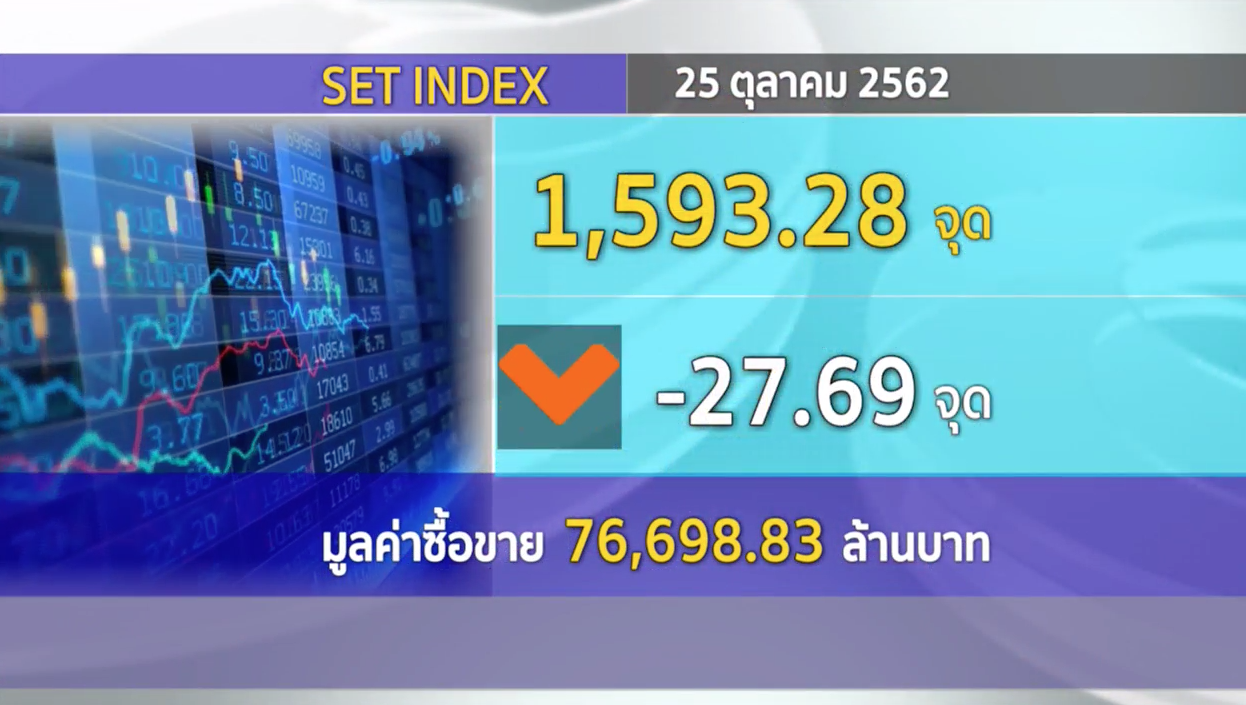 กทม. 25 ต.ค.- ตลาดหลักทรัพย์ปิดวันนี้ที่ระดับ 1,593.28 จุด ลดลง 27.69 จุด (-1.71%) มูลค่าการซื้อขาย 76,698.83 ล้านบาท.-สำนักข่าวไทย