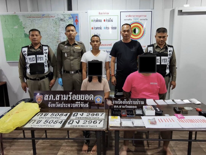 พ.ต.ท.ศุภฤกษ์ ตรีเจตน์ สวป.สภ.สามร้อยยอด จ.ประจวบคีรีขันธ์ พร้อมชุดเจ้าหน้าที่ตั้งจุดตรวจความเรียบร้อยตลอดคืนที่ผ่านมาบนถนนสายบ้านเกาะนาน้อย หมู่ 8 ต.ศิลาลอย อ.สามร้อยยอด กระทั่งเวลา 01.30 น. (27 ต.ค.) พบรถเก๋งต้องสงสัย สีเทา ทะเบียน 1กฒ 2331 กรุงเทพมหานคร พยายามจะเลี่ยงด่านตรวจจึงขอตรวจค้นพบยาบ้า 200 เม็ด ไอซ์ 216.69 กรัม อุปกรณ์การเสพ อาวุธปืนขนาด 9 มม. พร้อมกระสุน 15 นัด และแม็กกาซีนบรรจุกระสุน รวมทั้งป้ายทะเบียนรถ ฎง 2967 กทม. และ กข 5084 ประจวบคีรีขันธ์ เจ้าหน้าที่ได้คุมตัวนายธเนศ ภู่ระหงษ์ อายุ 33 ปี และเพื่อนสาวอายุ 38 ปี มาสอบปากคำ