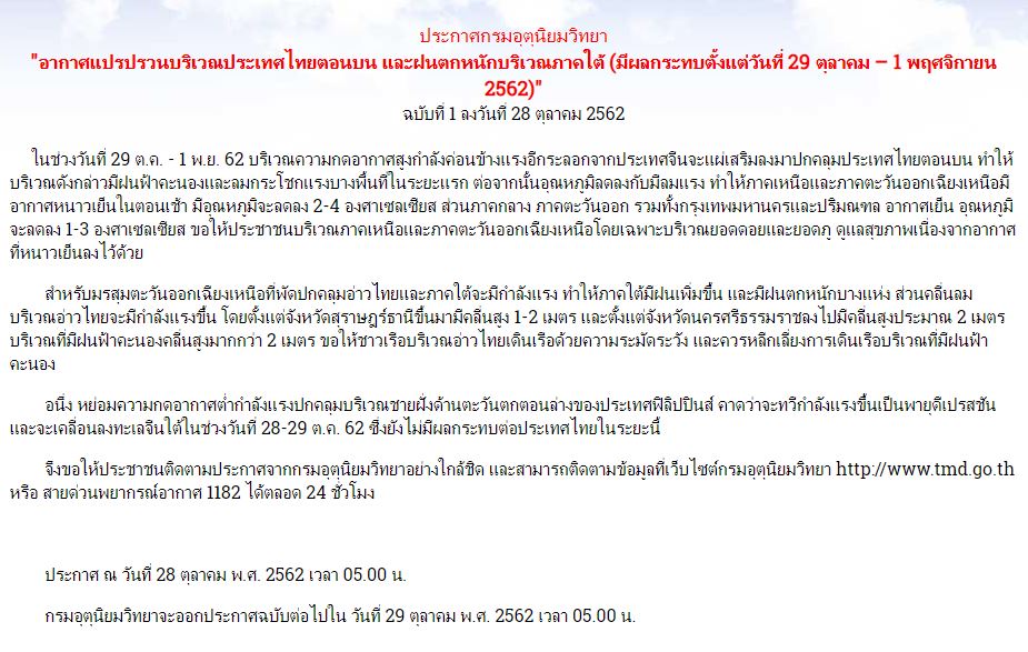 กรมอุตุนิยมวิทยาประกาศเตือนอากาศแปรปรวนบริเวณประเทศไทยตอนบน และฝนตกหนักบริเวณภาคใต้ ในช่วงวันที่ 29 ต.ค. – 1 พ.ย. 62 บริเวณความกดอากาศสูงกำลังค่อนข้างแรงอีกระลอกจากประเทศจีนจะแผ่เสริมลงมาปกคลุมประเทศไทยตอนบน ทำให้บริเวณดังกล่าวมีฝนฟ้าคะนองและลมกระโชกแรงบางพื้นที่ในระยะแรก จากนั้นอุณหภูมิลดลงกับมีลมแรง ทำให้ภาคเหนือและภาคตะวันออกเฉียงเหนือมีอากาศหนาวเย็นในตอนเช้า มีอุณหภูมิจะลดลง 2-4 องศาเซลเซียส