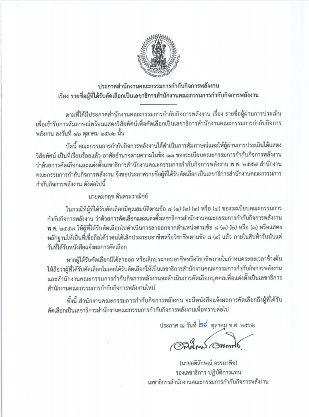 สำนักงานคณะกรรมการกำกับกิจการพลังงาน (สกพ.) ได้ประกาศรายชื่อผู้ที่ได้รับคัดเลือกเป็นเลขาธิการสำนักงานคณะกรรมการกำกับกิจการพลังงาน คนใหม่ วานนี้ (28 ต.ค.) ตามที่ได้มีประกาศ เรื่อง รายชื่อผู้ผ่านการประเมิน เพื่อเข้ารับการสัมภาษณ์พร้อมแสดงวิสัยทัศน์เพื่อคัดเลือกเป็นเลชาธิการสำนักงานคณะกรรมการกำกับกิจการพลังงาน ลงวันที่ 16 ตุลาคม 2562 โดย คณะกรรมการกำกับกิจการพลังงานได้ดำเนินการสัมภาษณ์และให้ผู้ผ่านการประเมินได้แสดง วิสัยทัศน์ เป็นที่เรียบร้อยแล้ว บุคคลที่ได้รับการคัดเลือก คือนายคมกฤช ตันตระวาณิชย์ รองเลขาธิการ สกพ.