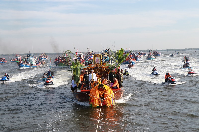สมุทรปราการ 31 ต.ค.- สมุทรปราการสืบสานประเพณีท้องถิ่นคลองด่านปีที่ 109 ขบวนแห่อลังการองค์เหมือน “หลวงปู่ปาน” ทั้งทางน้ำและบก ประกอบพิธีเวียน 3 รอบในอ่าวไทย ก่อนมอบธงเป็นสิริมงคลแก่เรือประมง