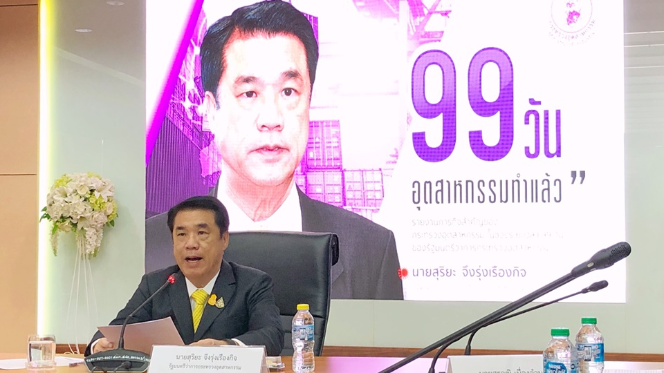 นายสุริยะ จึงรุ่งเรืองกิจ รัฐมนตรีว่าการกระทรวงอุตสาหกรรม แถลงผลการทำงานในช่วง 3 เดือน “99 วัน อุตสาหกรรมทำได้ ” ว่า ค่อนข้างพอใจกับผลการทำงานในช่วงที่ผ่านมา ที่ได้ดำเนินการร่วมกับภาคเอกชนโดยเฉพาะสภาอุตสาหกรรมแห่งประเทศไทย (ส.อ.ท.) เช่น การส่งเสริม Ease of Doing Business, การส่งเสริม Made in Thailand เป็นต้น และตอบโจทย์ของประชาชนในพื้นที่ เช่น การเพิ่มโอกาสในการเข้าถึงแหล่งเงินทุน