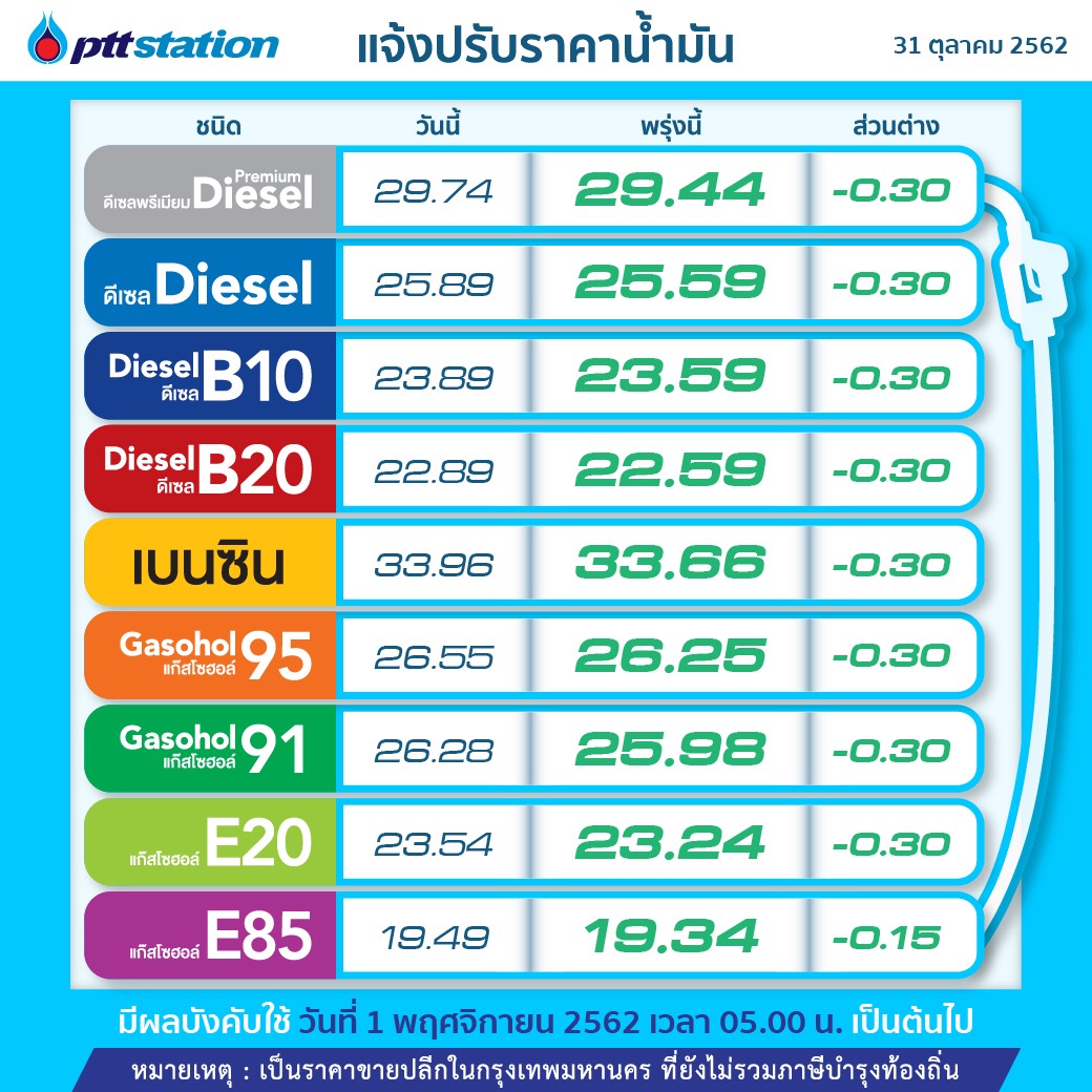 PTT Station และบางจากฯ ประกาศปรับลดราคาขายปลีกน้ำมันทุกชนิดลง 0.30 บาทต่อลิตร เว้น E85 ลดลง 0.15 บาทต่อลิตร มีผล 1 พ.ย. 2562 เวลา 05.00 น. เป็นต้นไป โดยราคาขายปลีก ของ พีทีทีสเตชั่นในเขตกรุงเทพฯ และปริมณฑล จะเป็นดังนี้ เบนซิน 33.66 บาท/ลิตร , GSH95 ราคา26.25 บาทต่อลิตร, E20 ราคา 23.24 บาท/ลิตร, GSH91 ราคา 25.98 บาทต่อลิตร, E85 ราคา 19.34 บาทต่อลิตร, ดีเซล 25.59 บาทต่อลิตร, ดีเซลพรีเมี่ยม 29.44บาทต่อลิตร ,B10ราคา 23.59 บาทต่อลิตร และB20 ราคา 22.59 บาทต่อลิตร โดยราคานี้ยังไม่รวมภาษีบำรุงกรุงเทพมหานคร