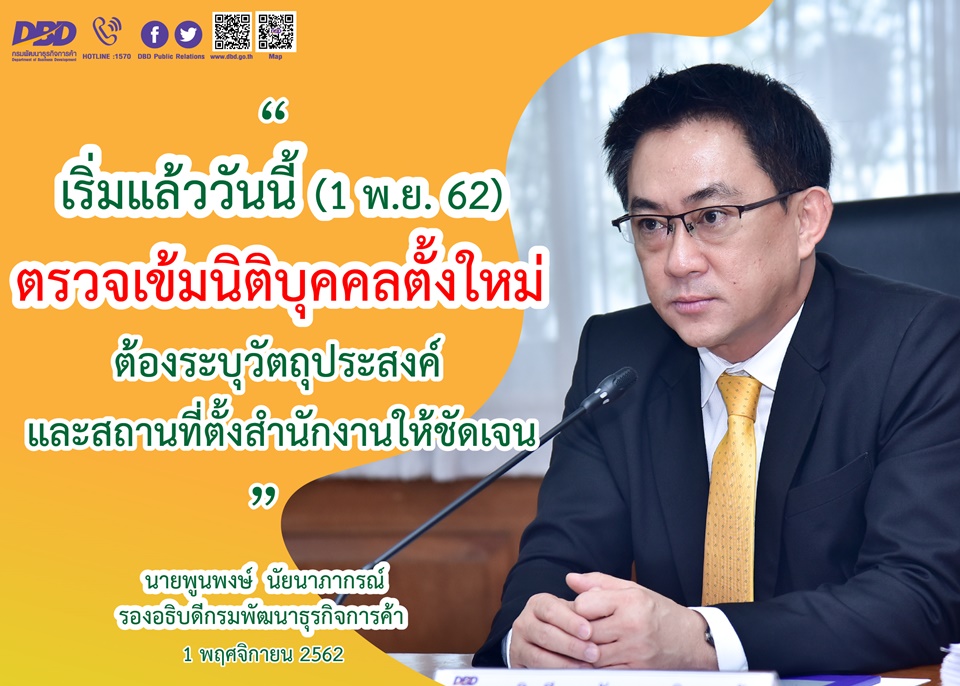 ทั้งนี้ นายวุฒิไกร ลีวีระพันธุ์ อธิบดีกรมพัฒนาธุรกิจการค้า ได้ออกประกาศกรมฯ เรื่อง การระบุข้อมูลประเภทธุรกิจ (วัตถุประสงค์) และสถานที่ตั้งสำนักงานให้ตรงกับข้อมูลที่แท้จริง ในการยื่นขอจดทะเบียนห้างหุ้นส่วนและบริษัทจำกัด พ.ศ.2562 โดยมีสาระสำคัญ คือ ให้ผู้ขอยื่นจดทะเบียนธุรกิจต้องระบุข้อมูลประเภทธุรกิจ (วัตถุประสงค์) ในแบบ สสช.1 และสถานที่ตั้งสำนักงานให้ถูกต้อง ตรงกับความเป็นจริงที่ประสงค์จะประกอบธุรกิจ โดยกรมฯ จะติดตามตรวจสอบความถูกต้องแท้จริงของข้อมูลการจดทะเบียนอย่างใกล้ชิด โดยเฉพาะอย่างยิ่งข้อมูลประเภทธุรกิจ (วัตถุประสงค์) ที่ผู้ขอจดทะเบียนธุรกิจได้ระบุในแบบ สสช.1 และสถานที่ตั้งสำนักงานที่ได้แจ้งไว้กับกรมพัฒนาธุรกิจการค้า หากพบว่ามีเจตนาที่จะระบุข้อมูลไม่ตรงต่อความเป็นจริง อาจเข้าข่ายเป็นการแจ้งความอันเป็นเท็จต่อทางราชการได้