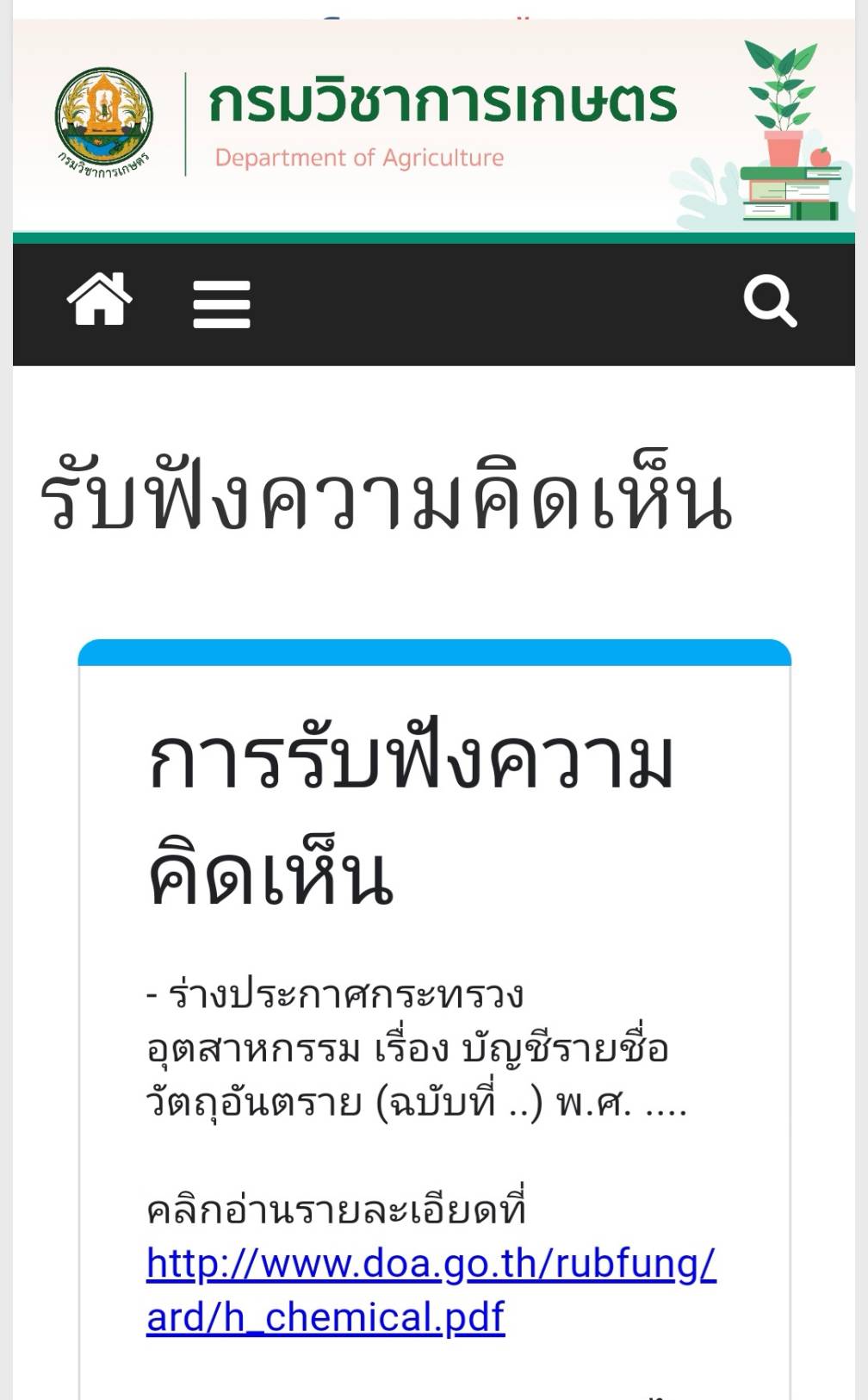 ผู้สื่อข่าวรายงานว่า ในเว็บไซต์ของกรมวิชาการเกษตรได้จัดทำแบบรับฟังความคิดเห็นร่างประกาศกระทรวงอุตสาหกรรรม