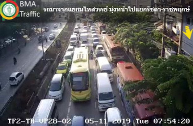 กทม. 5 พ.ย.-สวพ.FM91 รายงานจราจรเช้าวันอังคาร ถนนรัชดา – ท่าพระ ขาออก มุ่งหน้าแยกรัชดา – ตลาดพลู รถมาก เคลื่อนตัวช้า ส่วนถนนพหลโยธิน ผ่านหน้าฟิวเจอร์พาร์ค รังสิต รถน้อย