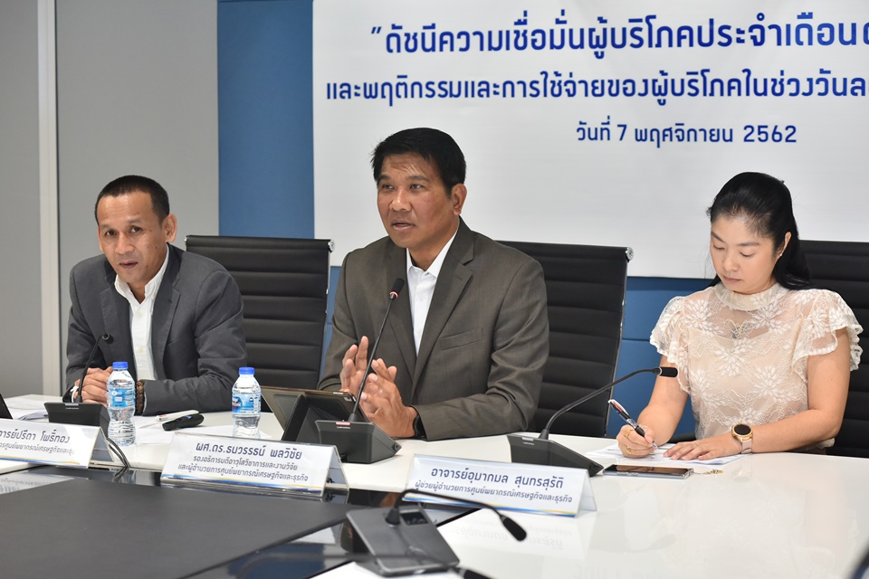 นายธนวรรธน์ พลวิชัย ผู้อำนวยการ ศูนย์พยากรณ์เศรษฐกิจและธุรกิจ มหาวิทยาลัยหอการค้าไทย เปิดเผยถึงผลสำรวจดัชนีความเชื่อมั่นผู้บริโภคเดือนตุลาคม 2562 ว่า ดัชนีมีการปรับตัวลดลงต่อเนื่องเป็นเดือนที่ 8 มาอยู่ที่ระดับ 70.2 ซึ่งเป็นดัชนีที่ต่ำสุดในรอบ 40 เดือน มาจากผู้บริโภคมีความกังวลต่อสถานการณ์เศรษฐกิจโลกที่ยังมีผลมาจากสงครามการค้าระหว่างสหรัฐและจีน ปัญหาการถูกตัดสิทธิจีเอสพี ปัญหาทางการเมืองของไทย ทำให้เศรษฐกิจโลกและเศรษฐกิจไทยชะลอ