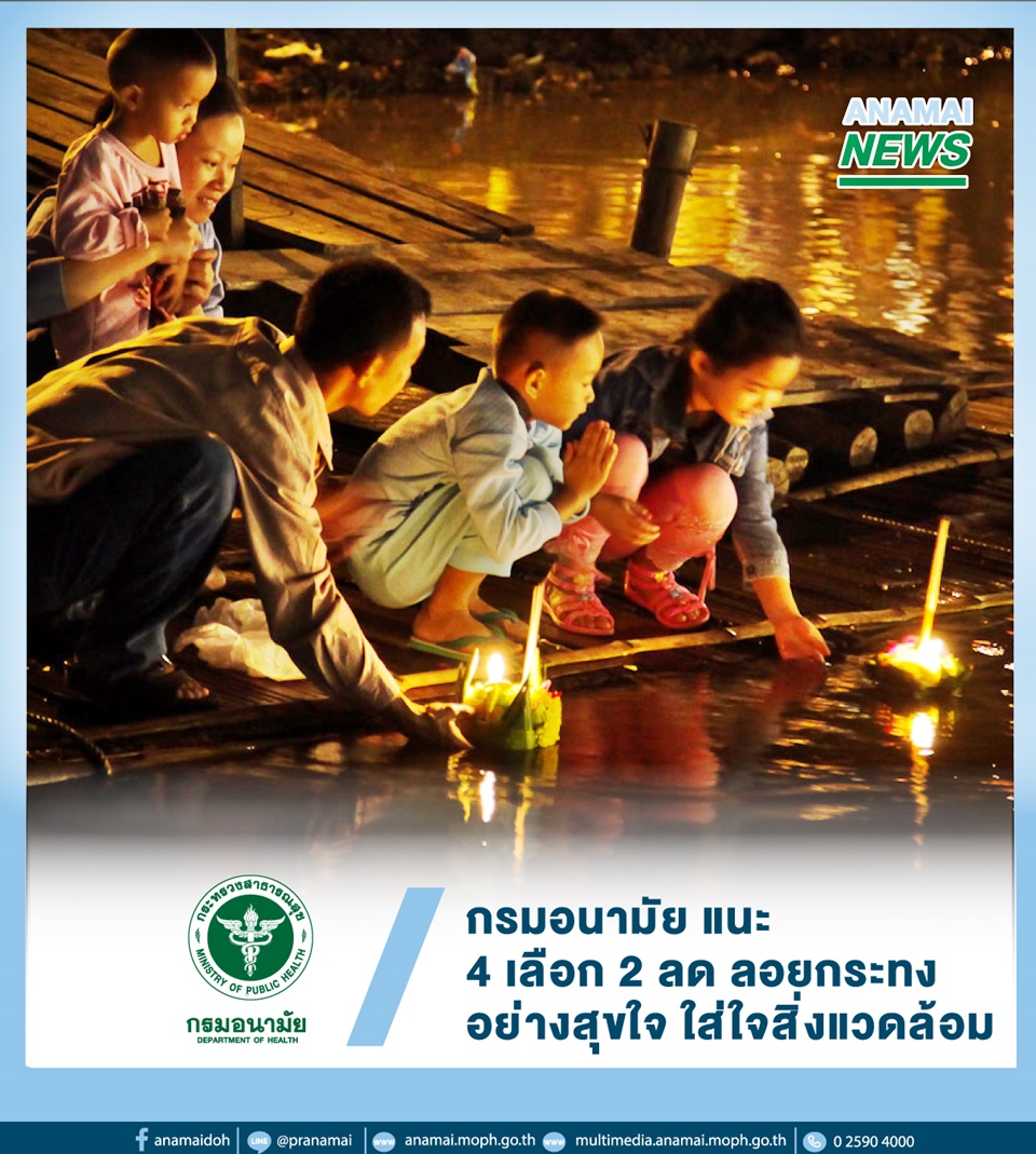กรมอนามัย 8พ.ย.-ลอยกระทงปีนี้ แนะใช้หลัก 4 เลือก 2 ลด ร่วมใจลอยกระทงอย่างเป็นมิตรกับสิ่งแวดล้อม เพื่อลดขยะ สร้างสิ่งแวดล้อมที่ดี