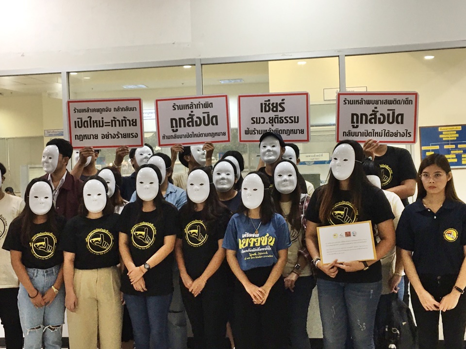 ที่ศูนย์ยุติธรรมสร้างสุข กระทรวงยุติธรรม นายชูวิทย์ จันทรส ผู้ประสานงานเครือข่ายรณรงค์ป้องกันภัยแอลกอฮอล์ พร้อมด้วย นายธีรภัทร์ คหะวงศ์ ผู้ประสานงานเครือข่ายเยาวชนป้องกันนักดื่มหน้าใหม่ นำกลุ่มเครือข่ายเฝ้าระวังธุรกิจสุรา (Alcohol Watch) เครือข่ายนักกฎหมายเพื่อเด็กและเยาวชน และกลุ่มหน้ากากขาว ซึ่งเป็นนักเรียนนักศึกษาจากหลายสถาบัน กว่า 30 คน เข้ายื่นจดหมายเปิดผนึกถึงนายสมศักดิ์ เทพสุทิน รัฐมนตรีว่าการกระทรวงยุติธรรม ในฐานะประธานคณะกรรมการอำนวยการประสานกำกับติดตามผลการดำเนินงานตามคำสั่งหัวหน้าคณะรักษาความสงบแห่งชาติที่ 22/2558 (ศอ.กต.) เพื่อขอให้ตรวจสอบและดำเนินการขั้นเด็ดขาดกับสถานบันเทิงที่เคยถูกสั่งปิดกิจการจากกรณีตรวจพบยาเสพติดและมีเด็กอายุต่ำกว่า 20 ปี เข้าใช้บริการ แต่ลักลอบกลับมาเปิดใหม่ในพื้นที่เดิม โดยมีว่าที่ร้อยตรี ธนกฤต จิตรอารีย์รัตน์ เลขานุการ รมว.ยุติธรรม เป็นผู้รับหนังสือ