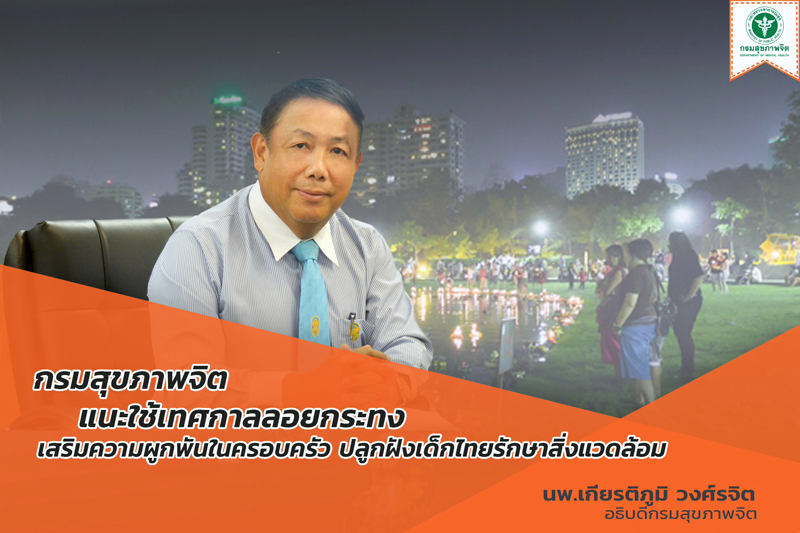 นายแพทย์เกียรติภูมิ วงศ์รจิต อธิบดีกรมสุขภาพจิต กล่าวว่า ประเพณีลอยกระทงถือเป็นประเพณีสำคัญอีกวันหนึ่งของปวงชนชาวไทย ซึ่งตรงกับวันขึ้น 15 ค่ำ เดือน 12 หรือวันเพ็ญเดือน 12 ของทุกปี ซึ่งในปี 2562 นี้ ตรงกับวันที่ 11 พฤศจิกายน โดยกรมสุขภาพจิต ขอเชิญชวนประชาชนคนไทยร่วมสืบสานประเพณีลอยกระทง ให้สมาชิกในครอบครัวได้ใช้เวลาร่วมกัน พ่อแม่ชักชวนลูกๆ ไปลอยกระทง เสริมสายใยรักความผูกพันในครอบครัว และเป็นการปลูกฝังให้เด็กๆ รักษาสิ่งแวดล้อม ซึ่งจะทำให้เด็กมีส่วนร่วมในกิจกรรมครอบครัวและสังคม ก่อให้เกิดคุณประโยชน์ต่างๆ ดังนี้