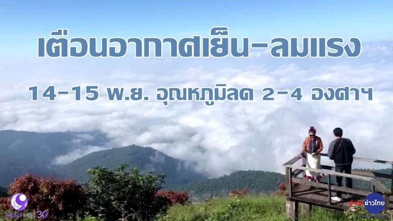 กรมอุตุนิยมวิทยา 14 พ.ย.-กรมอุตุฯ เตือนช่วงวันที่ 14-15 พ.ย.62 บริเวณภาคเหนือ อีสาน กลาง และตะวันออก มีอากาศเย็นกับมีลมแรง อุณหภูมิจะลดลง 2-4 องศาฯ ยอดดอยและยอดภูมีอากาศหนาว อุณหภูมิต่ำสุด 8-12 องศาฯ ขณะที่ภาคใต้มีฝนตกหนักบางพื้นที่ ส่วน กทม.-ปริมณฑล ฝนบางแห่ง ลมแรง อุณหภูมิต่ำสุด 24 องศาฯ