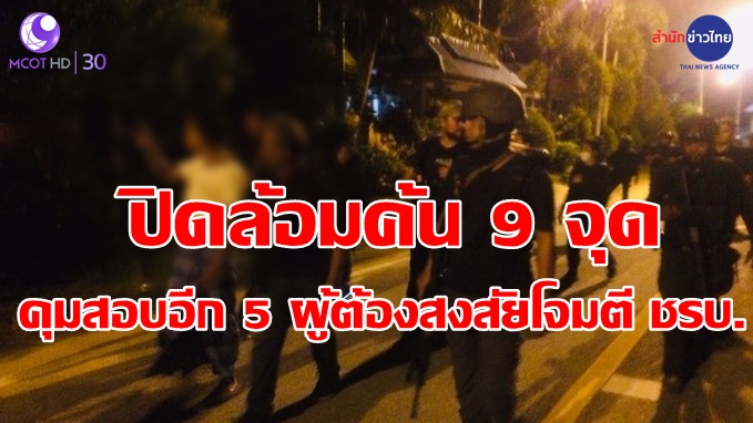 ยะลา 14 พ.ย.-เมื่อช่วงเช้ามืดที่ผ่านมา ตำรวจ-ทหาร เข้าปิดล้อมตรวจค้น 9 จุด ใน 3 อำเภอ จ.ยะลา คุมตัวผู้ต้องสงสัยอีก 5 คน สอบสวน คดีโจมตีป้อม ชรบ.ลำพะยา โดยหนึ่งในนั้นเป็นผู้ต้องสงสัยมือประกอบระเบิด