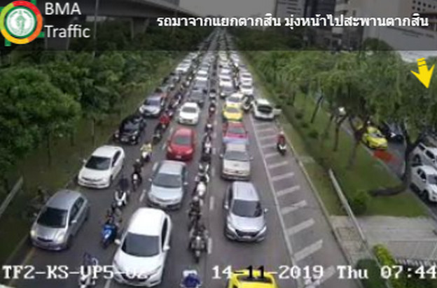 กทม. 14 พ.ย.-สวพ.FM91 รายงานจราจรเช้าวันพฤหัสบดี ถนนกรุงธนบุรี ข้ามสะพานตากสิน ติดขัด ท้ายแถวสะสมบีทีเอส วงเวียนใหญ่