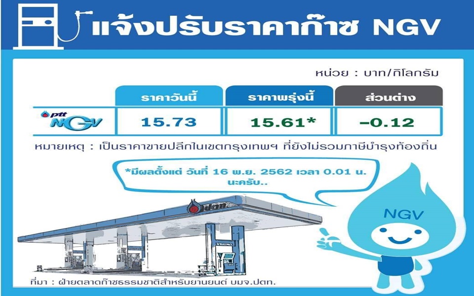 กรุงเทพฯ 15 พ.ย. – ปตท.ประกาศปรับลดราคาขายปลีกเอ็นจีวี 12 สตางค์ต่อกิโลกรัม มีผลตั้งแต่วันที่ 16 พฤศจิกายน 2562 เวลา 00.01 น. เป็นต้นไป ราคาใหม่ 15.61 บาทต่อกิโลกรัม.-สำนักข่าวไทย
