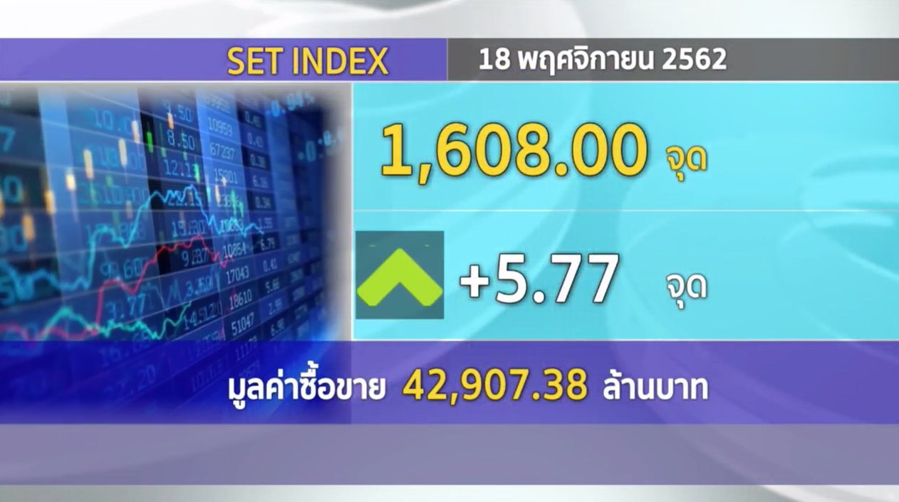 กทม. 18 พ.ย.- ตลาดหลักทรัพย์ปิดวันนี้ที่ระดับ 1,608.00 จุด เพิ่มขึ้น 5.77 จุด มูลค่าการซื้อขาย 42,907.38 ล้านบาท.-สำนักข่าวไทย