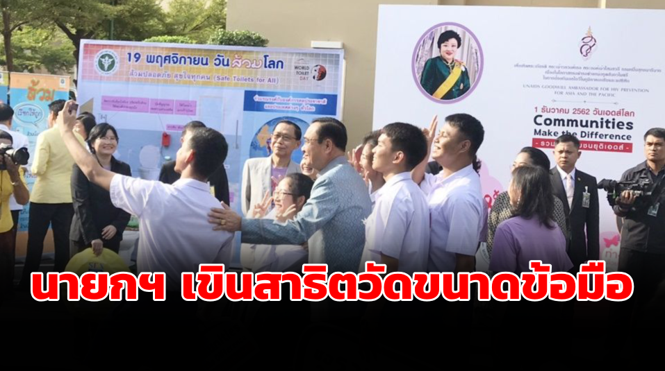 ก่อนการประชุมคณะรัฐมนตรี(ครม.) วันนี้(19พ.ย.) พล.อ.ประยุทธ์ จันทร์โอชา นายกรัฐมนตรีและรัฐมนตรีว่าการกระทรวงกลาโหมเยี่ยมชมการจัดนิทรรศการประชาสัมพันธ์ของหน่วยงานต่าง ๆ อาทิ กระทรวงสาธารณสุขร่วมรณรงค์วันส้วมโลก 19 พฤศจิกายน เพื่อสนับสนุนการใช้ส้วมที่ถูกสุขอนามัย ขณะที่วันที่ 1 ธันวาคตรงกับวันเอดส์โลก ซึ่งนายกรัฐมนตรีร่วมติดเข็มและริบบิ้น สัญลักษณ์การรวมพลังยุติเอดส์ พร้อมรณรงค์ให้สวมถุงยางอนามัยทุกครั้ง ซึ่งนายกรัฐมนตรีมีอาการเขินอายเมื่อเจ้าหน้าที่สาธิตการวัดขนาดอวัยวะเพศที่ข้อมือด้านซ้ายของนายกรัฐมนตรี เพื่อการใช้ถุงยางอนามัยให้ถูกต้อง