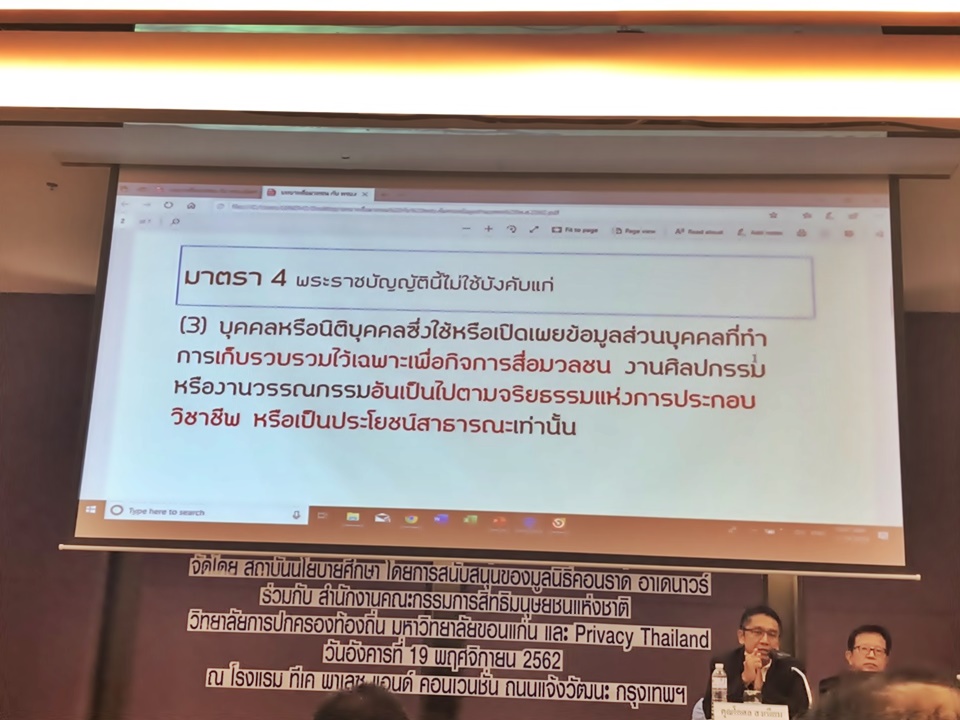 นางประกายรัตน์ ต้นธีรวงศ์ กรรมการสิทธิมนุษยชนแห่งชาติ เปิดการสัมมนาเรื่อง ความเป็นส่วนตัวกับกฎหมายคุ้มครองข้อมูลส่วนบุคคล ภายใต้โครงการ การคุ้มครองข้อมูลส่วนบุคคลของพลเมือง ว่า ปัญหา การละเมิดสิทธิส่วนบุคคล ปัจจุบันมีมาก เพราะด้วยเทคโนโลยีเจริญก้าวหน้า ทำให้บุคคลถูกละเมิดความเป็นส่วนตัว เสียทั้งความเป็นส่วนตัว และทรัพย์เพื่อคุ้มครองความเป็นส่วนตัว จึงได้เกิด พ.ร.บ.คุ้มครองข้อมูลส่วนบุคคล ปี2562 ขึ้น เน้นการคุ้มครอง ทั้งสิทธิเสรีภาพ ,การปฎิบัติตามเจตนารมย์ ,สิทธิคามเป็นส่วนตัว ,สิทธิทางร่างกาย การนำข้อมูลพื้นฐานเหล่านี้ต้องได้รับความยินยอมจากเจ้าของข้อมูล เพราะปัจจุบันข้อมูลฐานส่วนบุคคล ไม่ว่าจะทำกับรัฐ หรือเอกชน ตั้งแต่ขอไฟฟ้า ทะเบียนราษฎร หรือแม้แต่การร่วมโครงการประมูลของเอกชน การเช่าอาคาร ข้อมูลชื่อที่อยู่ เบอร์โทร อีเมล์ สามารถค้นหาได้ทางอินเทอร์เน็ต ดังนั้น ต้องการสร้างความรับรู้และตระหนัก