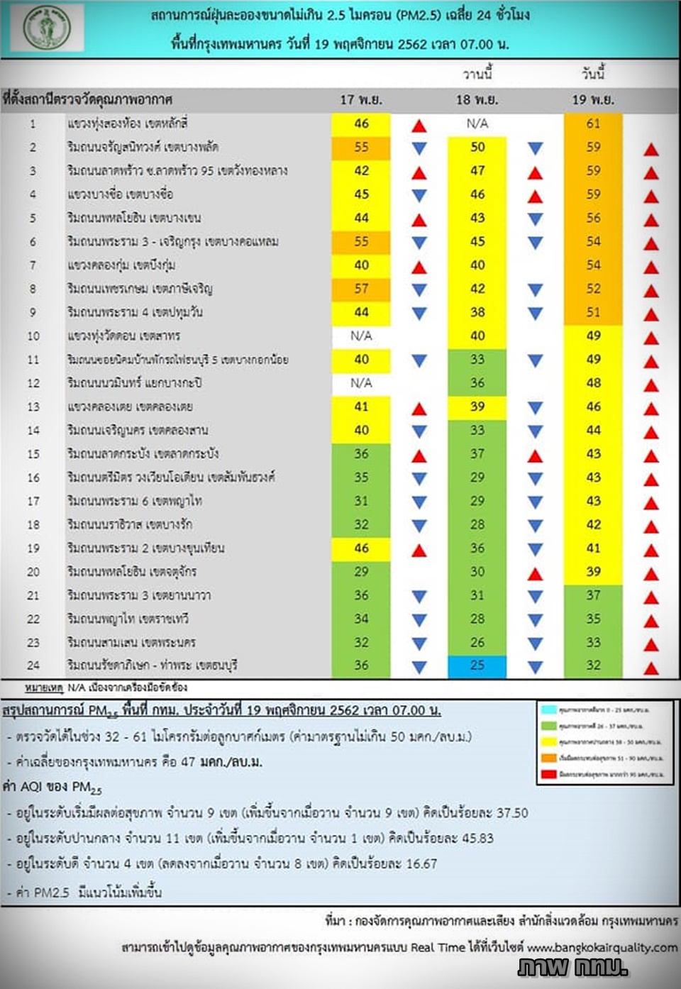 The Environment Department of the Bangkok Metropolitan Administration reported that particulate matter 2.5 micrometers and less in diameter (PM2.5) measured 30-61 micrograms per cubic meters of air in the past 24 hours as of 5-7am. The safe threshold is at 50mcg.