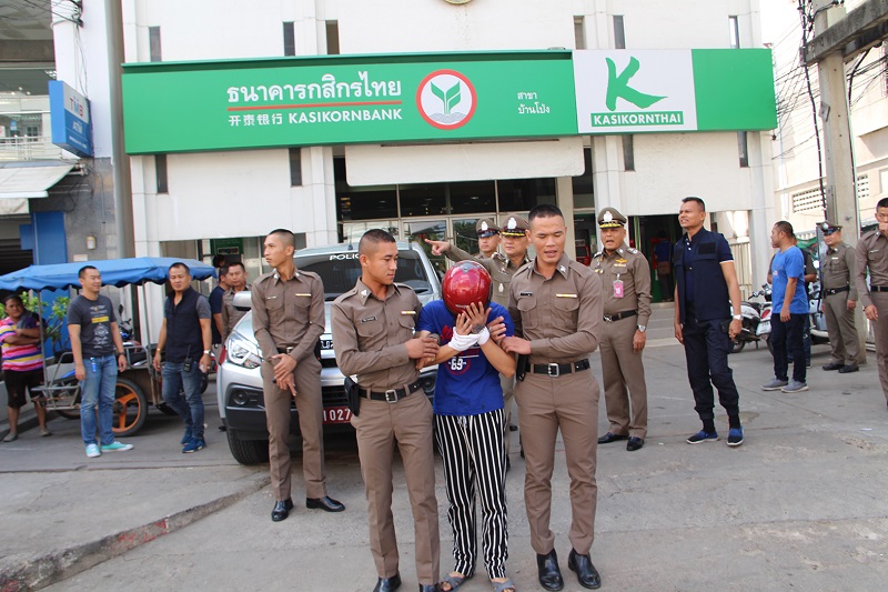 เมื่อเวลา 11.30 น. (20 พ.ย.) พ.ต.อ.ศิริชัย ไชยดี ผู้กำกับการ สภ.บ้านโป่ง จ.ราชบุรี นำชุดเจ้าหน้าที่เข้าตรวจสอบเหตุจี้ชิงทรัพย์ธนาคารกสิกรไทย สาขาบ้านโป่ง จ.ราชบุรี และสามารถควบคุมตัวผู้ก่อเหตุไว้ได้ คือนายนฤดม (สงวนนามสกุล) อายุ 22 ปี พร้อมของกลางปืนไฟแช๊ค มีด และระเบิดปลอม